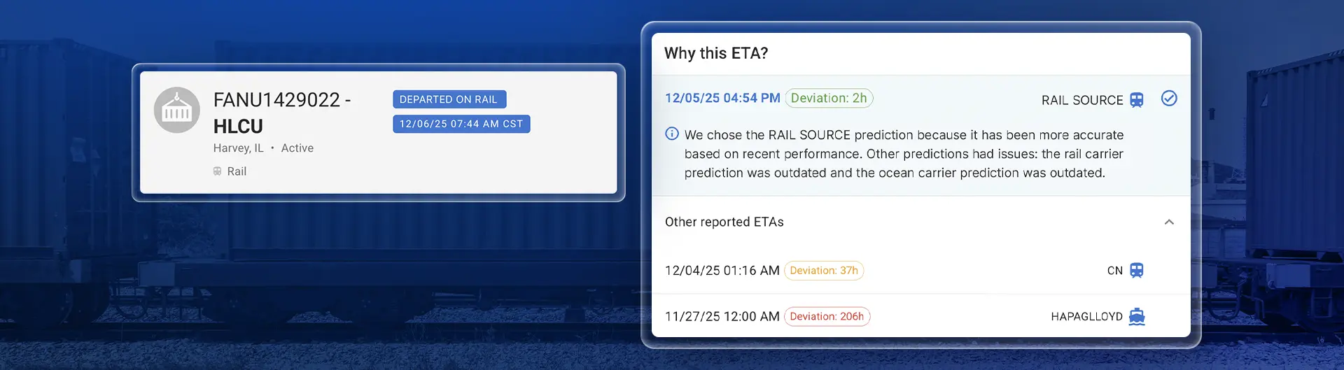 Data Explainability goes beyond simply displaying ETAs and Last Free Days. It shows you the complete picture: every data source we consulted, the alternatives we considered, and the reasoning behind why we selected the information we're showing you.